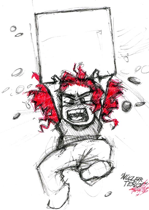 this idea came to my mind while viewing some old japanese artwork showing samurai throwing gobans. they alltogether looked kinda stiff - so I imagined myself performing this ,,nuclear tesuji`` and put it quickly and hastily on paper. I just used some black markers and a red one for the hair.