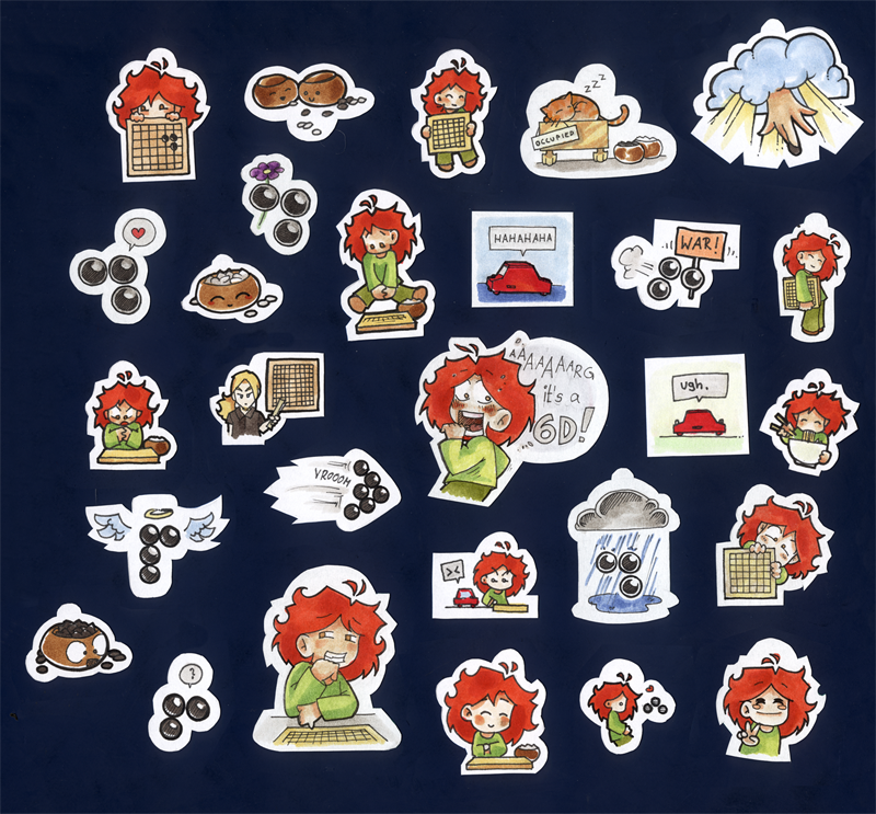 first batch of minis - I foil them and cut them out and attach a little string, making a little unique pendant out of each. I sell them at various tournaments I get invited to, mostly Berliner Kranich and the European go congresses.
