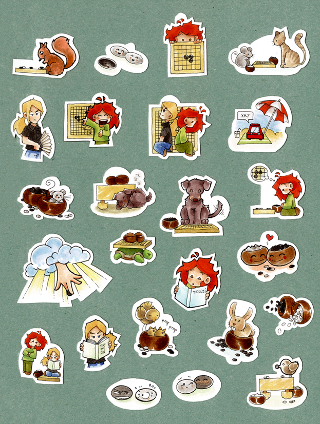 fourth batch of minis - I foil them and cut them out and attach a little string, making a little unique pendant out of each. I sell them at various tournaments I get invited to, mostly Berliner Kranich and the European go congresses.