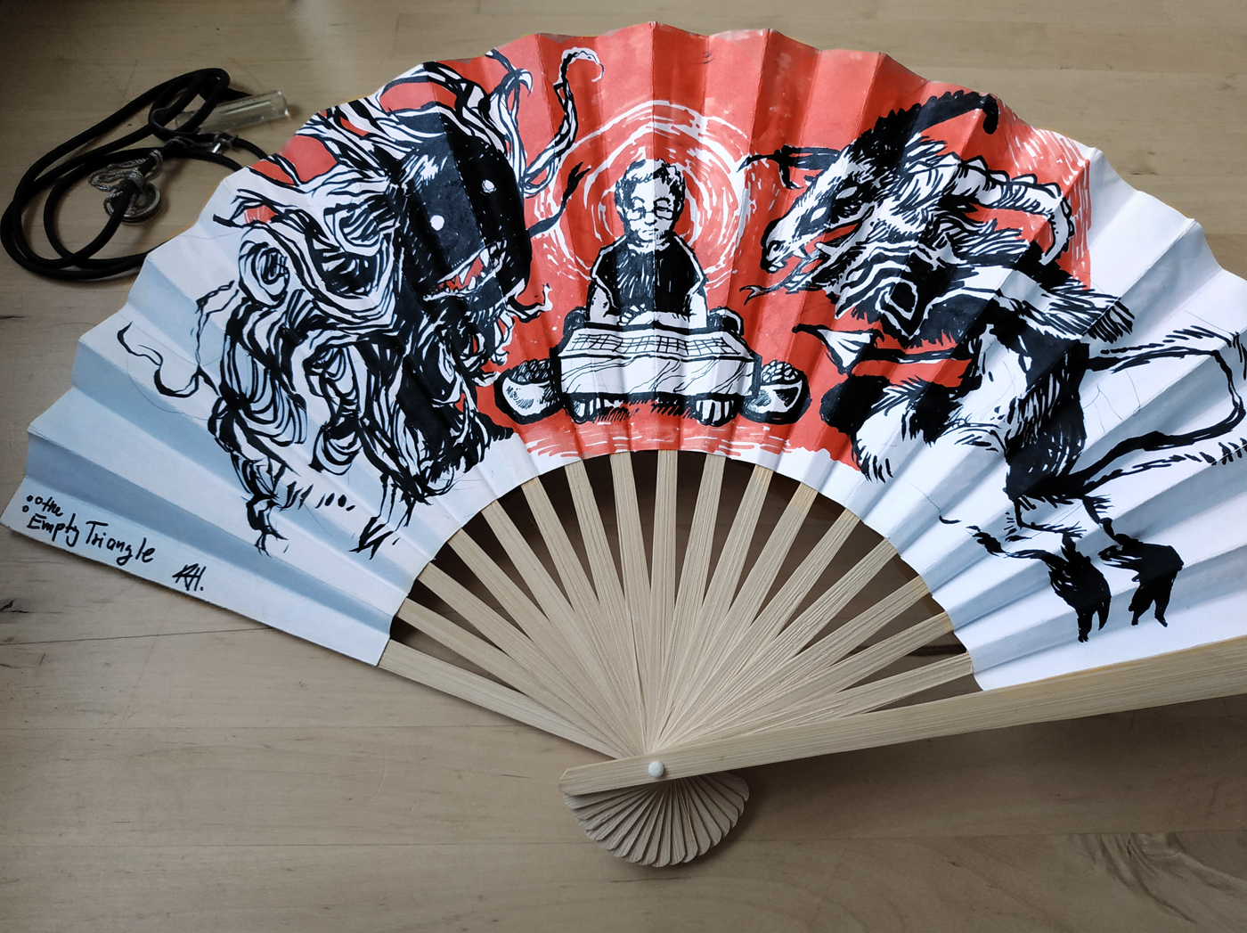 A very interesting fan for an old friend who requested two demons watching him play. The end result looks pretty intimidating, good for waving it around at tournaments to frighten the opponent!